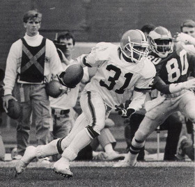 Franky Minnifield is a native of Lexington, Kentucky, who graduated from Henry Clay High School and the University of Louisville. After graduating from Louisville, he played cornerback for the NFL's Cleveland Browns for nine years, from 1984 -93. During this time, Franky made the Pro Bowl 4 years straight, All NFL 3 years and played in 3 AFC championship games. Upon his retirement from professional football, he returned home to Lexington, where he still resides with his wife, Diane, and two children, Chase and Chanel. Franky displays the same tenacious commitment to his business and civic endeavors as he exhibited in his pro football career. In 2006, he received the Volunteers of America "Person of the Year" Award. In 1997, Minnifield Enterprize was selected as Lexington's "Minority Business of the Year". Franky has served on several boards including the YMCA of Central Kentucky, LexTran, Governor's Sports Commission, the Lexington Sports Authority, and currently, Community Trust Bank and the University of Louisville. In addition, Franky is a member of several halls of fame including: Henry Clay High School Hall of Fame, University of Louisville Hall of Fame, Kentucky Athletic Hall of Fame, Cleveland Sports Hall of Fame, and the Kentucky Pro Football Hall of Fame. Frank's Dawg PoundHi, my name is Frank Minnifield. I was born January 1, 1960, in Lexington, Kentucky. I played defensive back for the Cleveland Browns from 1984-93. I attended Henry Clay High School in Lexington, but was considered too small for college football at just 5'9" and 140 pounds. I walked on to the football team at the University of Louisville, and as a junior in 1981, I led the nation in average yards per kickoff return (30.4). After graduation in 1982, I joined the Chicago Blitz (later the Arizona Wranglers) of the USFL, but I had to successfully sue the Wranglers for the right to move to the NFL, where I signed as a free agent with the Browns in 1984. I quickly became a fixture at cornerback for the Cleveland Browns and was named to the Pro Bowl four straight years from 1986-89. I was named to the NFL 1980s All-Decade Team as selected by voters of the Pro Football Hall of Fame, but perhaps more importantly to Cleveland fans, my fellow cornerback Hanford Dixon and I originated and named the Dawg Pound cheering section at Cleveland Stadium. The "Dawg Pound" started during the 1985 Training Camp at Lakeland Community College in Kirkland, Ohio. Hanford and I started the idea of the pound to try to get more pressure on the quarterback. We had the idea of the quarterback being the cat, and the defensive line being the dog. Whenever the defense would get a regular sack or a coverage sack the defensive linemen and linebackers would bark. This attitude carried into the stands at the training camp, where fans started barking along with the players. We then put up the first "Dawg Pound" banner in front of the bleachers before the first preseason game at old Cleveland Stadium. The bleacher section had the cheapest seats in the stadium, and its fans were already known as the most vocal. They adopted their new identity whole-heartedly, wearing dog noses, dog masks, bone-shaped hats and other outlandish costumes. "Woof" "Woof" There you have it. Franky Minnifield The 2013 NFLPA, Kentucky Chapter Blanton Collier AwardFATHER JACK HARBAUGH AND SONS JIM and JOHN RECEIVED THE NFL/COLLIER AWARD JUNE 28, 2013 IN LOUISVILLE, KY